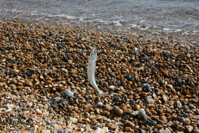 Picture of fish on the line. Click for larger image.Anyway, yesterday was a lovely Summer day, warm, not windy and ideal for an afternoon at the beach. To get Alex his first fish, it was obvious that mackerel would be the target as they they are easy and a virtual certainty. Anna and I packed up the beach stuff and headed off to Seaford. As we walked on to the beach, it was evident that a lot of our local population were also enjoying the afternoon sun. After a bit of walking, we found a decent spot to settle down.Picture of first fish. Click for larger image.