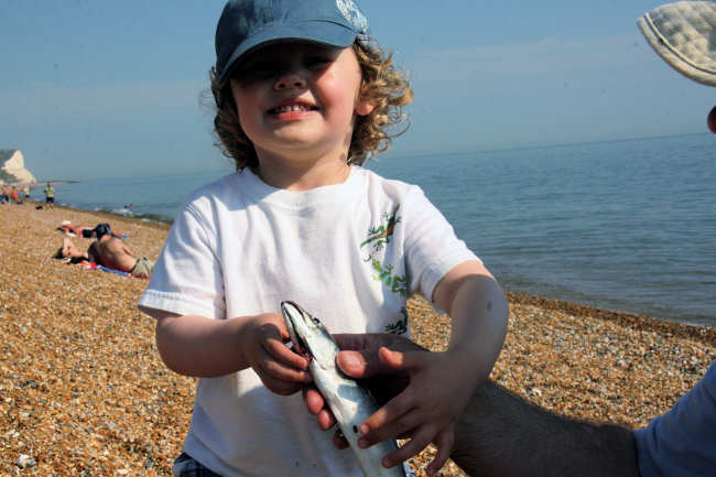 My son Alex who is just over three years old has been showing an interest in fish I bring home, often asking where it comes from and how I got it. He likes to handle fish and examine and generally poke them in the way that kids of his age do. Recently he was mightily impressed with the small dead fry that was stuck to my shoe. He was even more impressed when I told him that it had been ‘sicked up’ by a Mackerel that I’d previously caught and was in the process of gutting and cleaning.