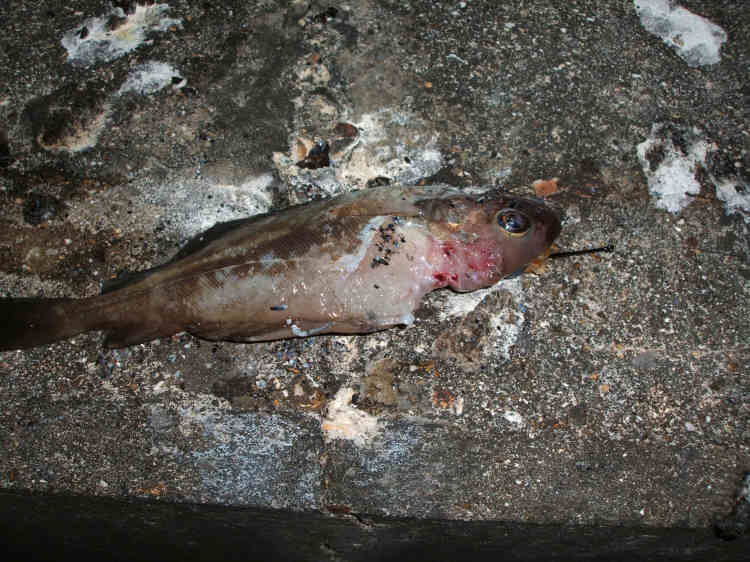 Half a Pout - click for larger imageAs darkness came, Mike was first in with a Pout. I was next in with a Co-Op carrier bag which appeared under-conditioned, scrawny and tattered although it did put up quite a fight in the tidal current and then in the air with that bloody wind. My next retrieve was a double shot of Pout which is how the rest of the evening went with more Pout for us both and only broken by a ‘snotty’ eel for Mike which wrecked his rig and a small schoolie bass for me. The only highlight being the non-appearance of any rockling. Mike also had ‘half’ a Pout which had been attacked  and partly scoffed by a squid whilst on the hook (Pictured right. Click for a larger image).