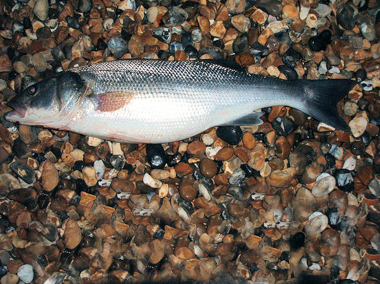 Seaford bass - click for larger imageI haven’t managed to get out for a while, so took when the opportunity came up to go out for a session last night, I took it and decided to fish a regular spot at Seaford beach. I got there at about 8pm and set up just West of Edinburgh Road. The weather was calm with very little breeze and what there was came from NW. The sky was clear but cloudy over to the West and could have been heading my way (but didn’t). The water was clear and calm with just a bit of wave action as the tide started to flood. High water was predicted to be a biggie at over 7 metres and due at around 2am.