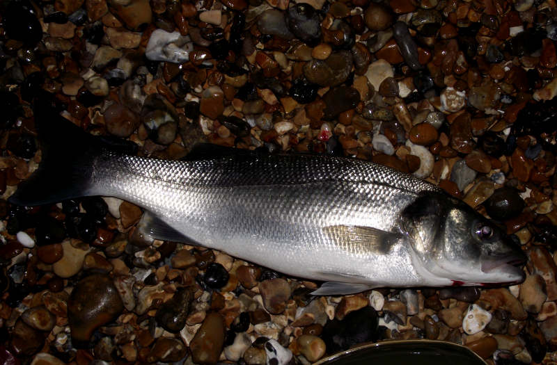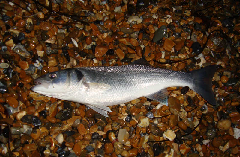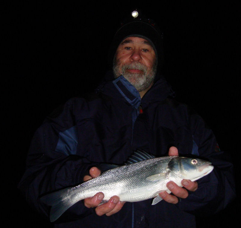 After a long wait until about two hours before high water, the fist ‘proper’ fish of the night turned up, a small school bass of about 1½lbs which took the squid at around 20 yards out. It was quickly returned and another squid sent out to approximately the same distance but I had to wait another hour and a couple of bait changes before the next one obliged and that was a similar sized bass which conveniently spat the hook just as I landed it, so it was simple process of just nudging it back into the waves.