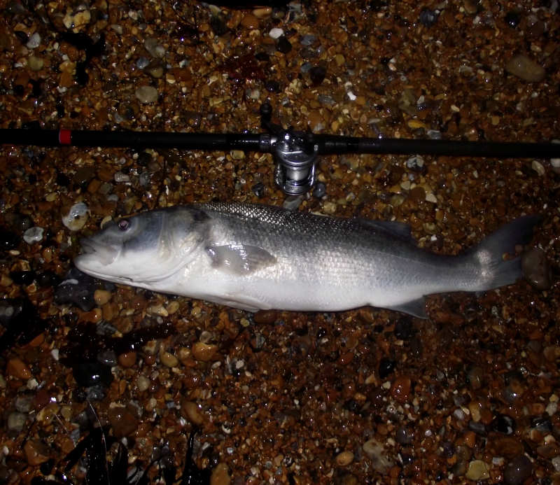 I had just put the rod in the rest, so I could dig out a spare tip light, when the rod tip slammed down and the butt slipped out of the cup and shot skyward. I made a grab for it and could feel a hard fighting bass on t’ other end, I felt sure that this going to be a cracker! I gently but firmly steered the fish through the breakers, letting take line when it wanted – I did not want lose this one! I go the timing just right and I let the next big wave carry it up the shingle, where I was surprised to see it was smaller than I expected; nevertheless, it was still a reasonable bass of 60cm and 5lbs 1oz.