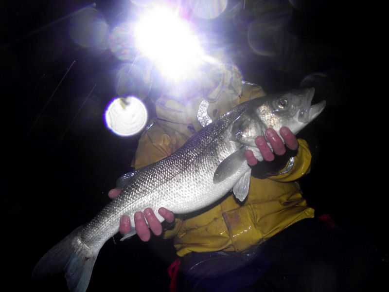 At about 1am, I had a huge pull down of a bite and was briefly connected to what felt like a reasonable bass before it spat the bait – at least I knew there were fish in the vicinity. 1.30am, I had another pull down and this time the fish stayed on and was soon beached, a plump little 42cm, two pounder. Couldn’t get a picture, as the camera came up with some cryptic warning of a ‘card error’, which later turned out be that the card wasn’t seated properly and easily remedied.