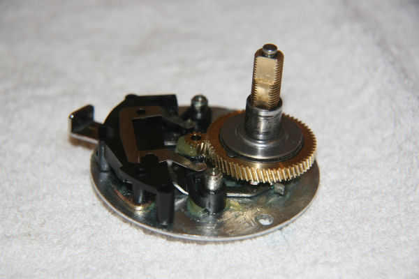 From inside, looking at the magnetic seat (magnet carrier), there is a screw in the centre, which when unscrewed, will release the small knurled magnet adjuster from the carrier and both parts can be removed from the side plate. There is no real need to take things apart any further here unless there are damaged items that need replacing. A general clean out of any debris, grit and old grease will suffice. Before re-assembly, apply a smear of new grease to moving parts and a drop of oil to the spindle of the large white Oscillation cog wheel. Fig 38