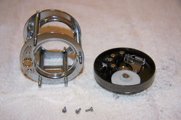 Undo the two smaller side plate screws to release the side plate from the brake plate and the internals. Be careful not to lose the two small plastic washers off the screws, as I reckon they’ll be harder to find than a straight answer from a politician. Pop out the bushing that sits under the knurled cast control cap that was removed in the previous step. You may well find that sitting in the hole left by the drive shaft, will be two spring washers, dig the critters out and put to one side for cleaning. Figs 6, 7, 8 & 9