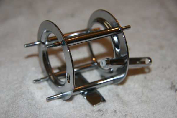 Undo the three knurled captive screws on the right hand side plate and remove it. The spool shaft (spindle) may come out attached to the side plate. Slide the spool out of the cage and put to one side for the moment. Fig 3.