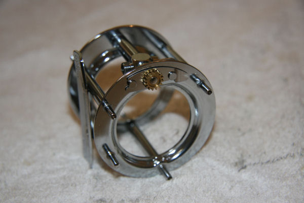 Now for the level wind system. Looking at the end of the cage, release the the thin, curved lock plate by sliding from under the small brass cog. Figs 40 & 41